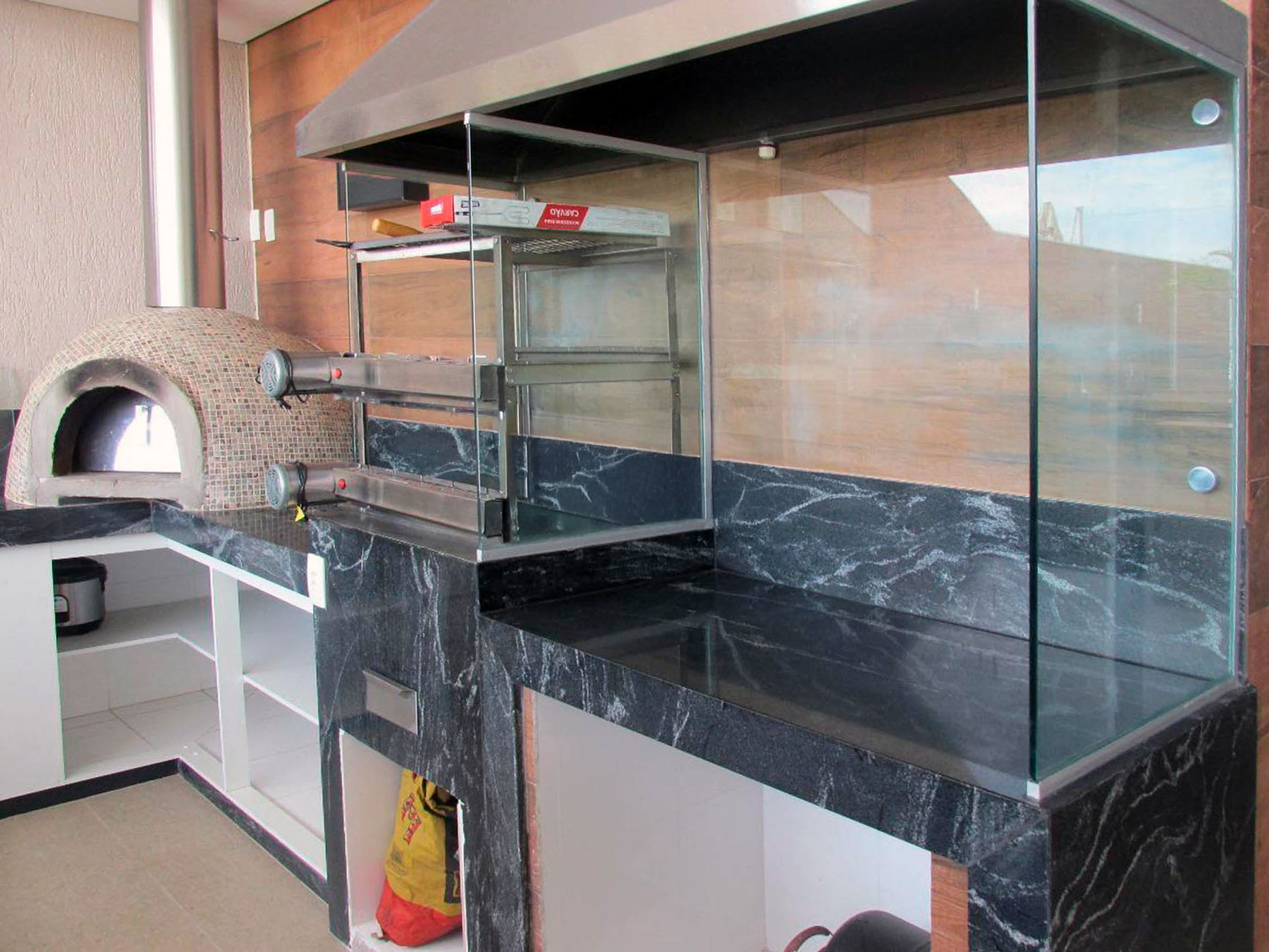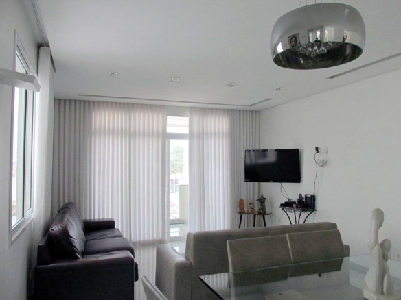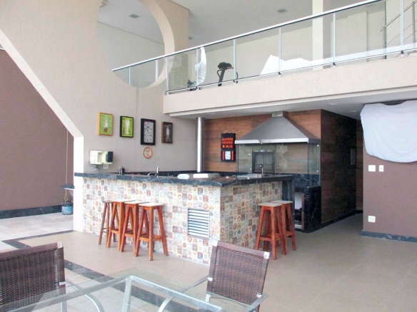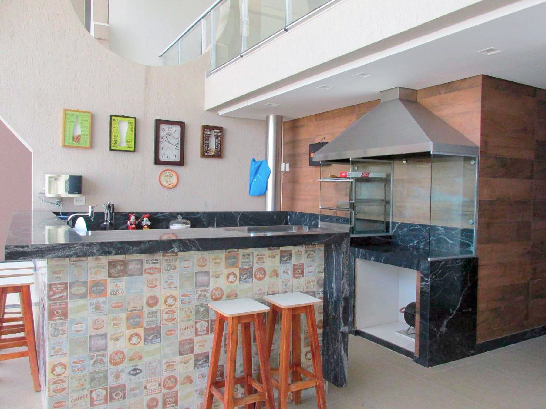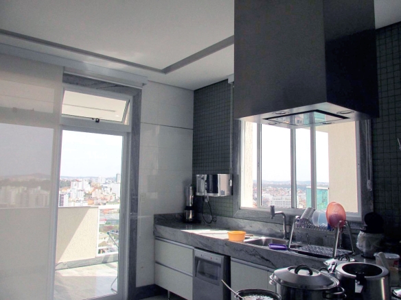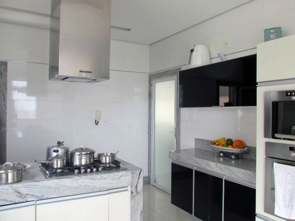 1º andar: Sala para 2 ambientes com piso de porcelanato branco, lavabo com piso de porcelanato, revestimento na metade da parede em porcelanato e o restante da parede com um lindo revestimento de papel, varanda com vista panorâmica e definitiva, com piso em granito, guarda corpo da sala e varanda eletrostático. Cozinha ampla com vista panorâmica, piso de porcelanato branco, móveis planejados, bancada de sobrepor com fogão cook top, coifa, forno, diversas bancadas em granito, despensa com várias prateleiras, lavanderia, DCE, com entrada lateral para recebimentos diversos.