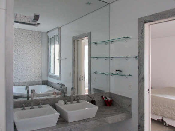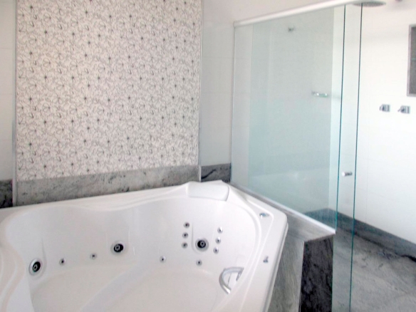2º andar: Sala de TV com piso de porcelanato branco, lindo jardim de inverso com entrada de ventilação para refrigerar toda a casa, 4 quartos, sendo 2 suítes e 1 semi-suíte. Suíte do casal composta de piso porcelanato bege, closet com móveis planejados, amplo banheiro, Box blindex, banheira de hidromassagem, chuveiro duplo, bancada com bojo individualizado, piso em granito. 1 suíte com armários, piso porcelanato bege, Box Blindex, bancada em granito. 2 semi-suítes com armários, piso de porcelanato bege, Box Blindex, bancada em granito.