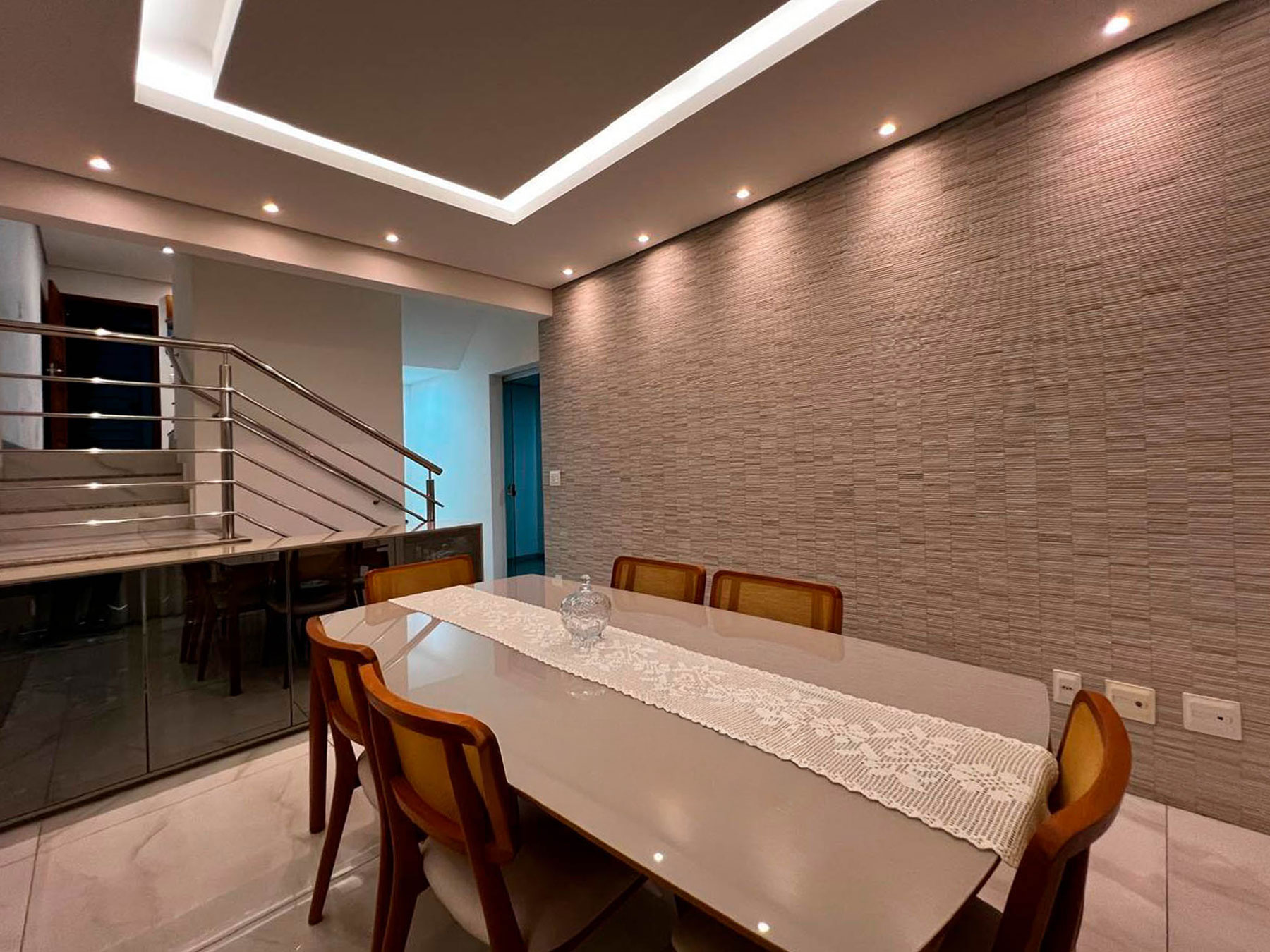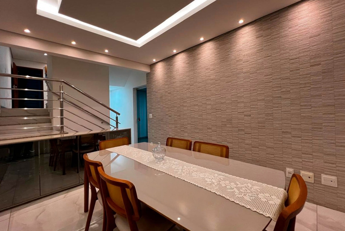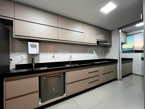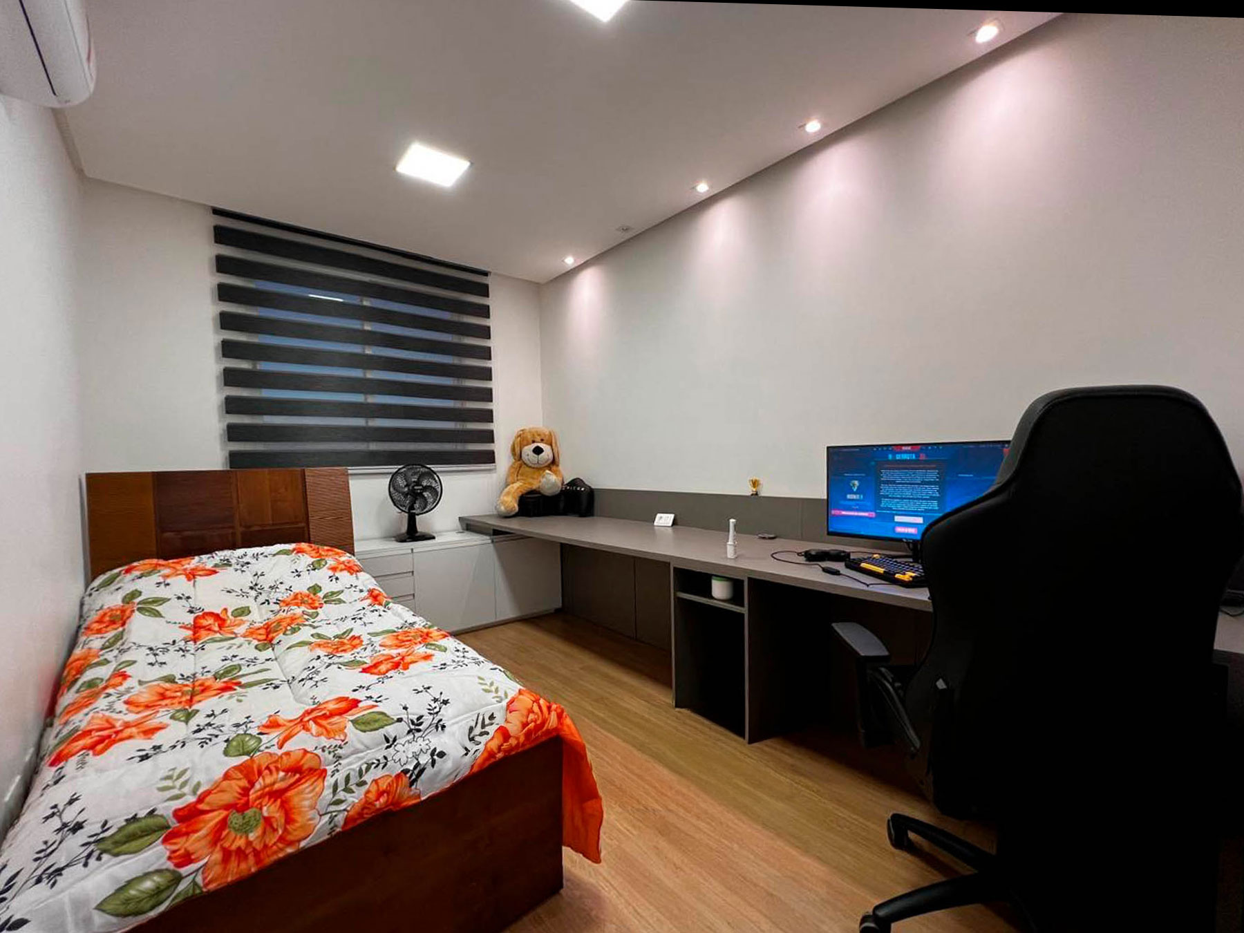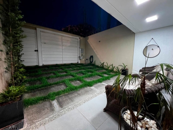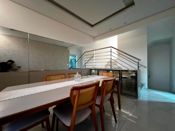 Com três quartos — incluindo uma suíte com closet e varanda — e duas vagas de garagem, o imóvel se destaca pelo excelente padrão de acabamento. No primeiro pavimento, as salas de estar e jantar apresentam piso em porcelanato, teto rebaixado em gesso e armários planejados, além de uma cozinha moderna equipada com fogão de indução, forno elétrico e bancada em granito. A área de serviço também conta com armários e acabamento refinado.