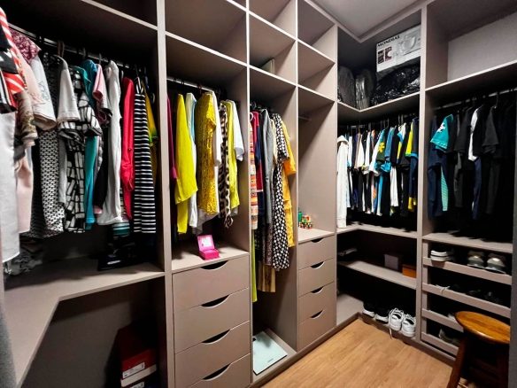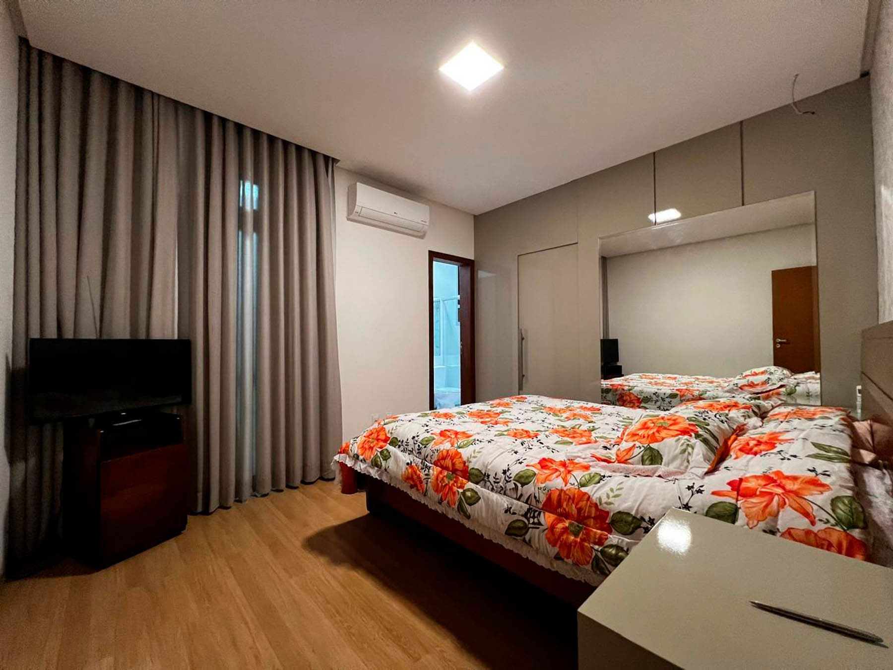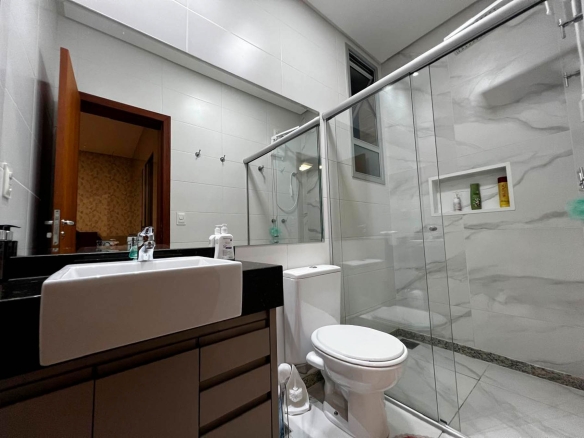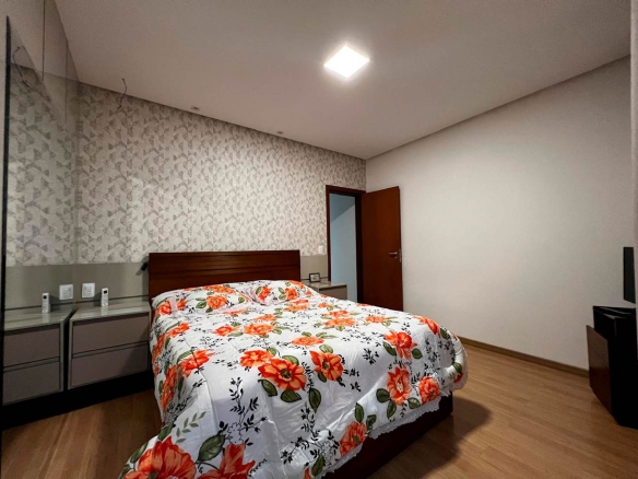 No segundo pavimento, os quartos possuem piso laminado, ar-condicionado e armários planejados. O banho social e o terraço com ducha garantem praticidade e momentos de lazer com uma vista definitiva. Já o terceiro pavimento oferece uma ampla sala que pode ser utilizada como cinema ou salão de jogos, acompanhada de um banho social e uma área externa gramada nos fundos.