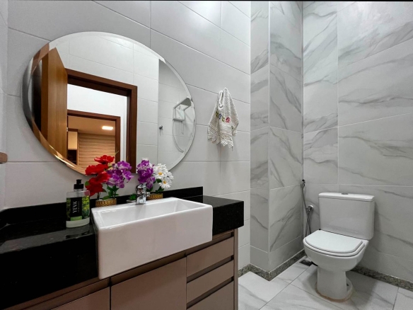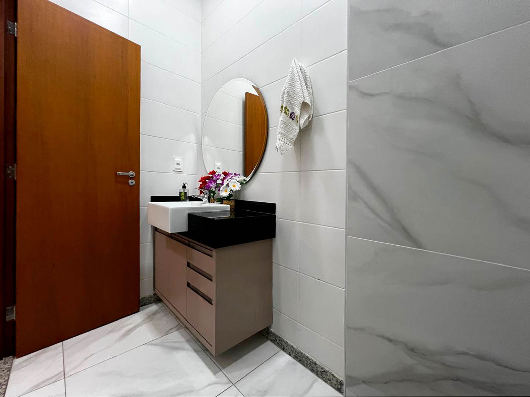 A casa ainda dispõe de aquecimento solar, pré-disposição para água quente nos chuveiros e acabamentos de alto padrão em todos os ambientes.